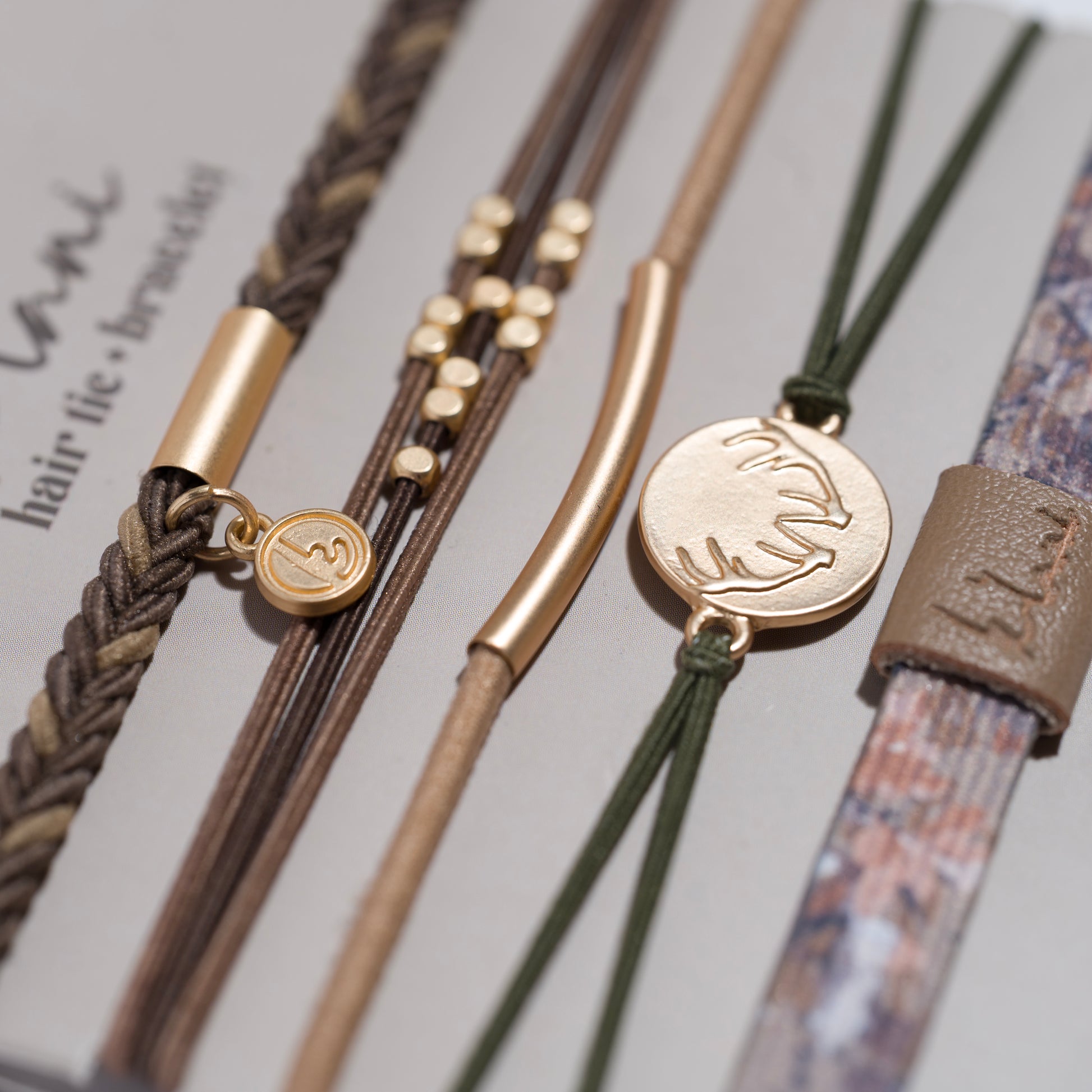 The Adapt set comes with 5 hair tie bracelets in earthy neutral tones, including one band with a bold trendy camouflage pattern. This set is accented with gold charms and antler details. Adapt set is all about strength and resilience- A reminder to stay grounded, flexible, and ready for whatever comes your way.