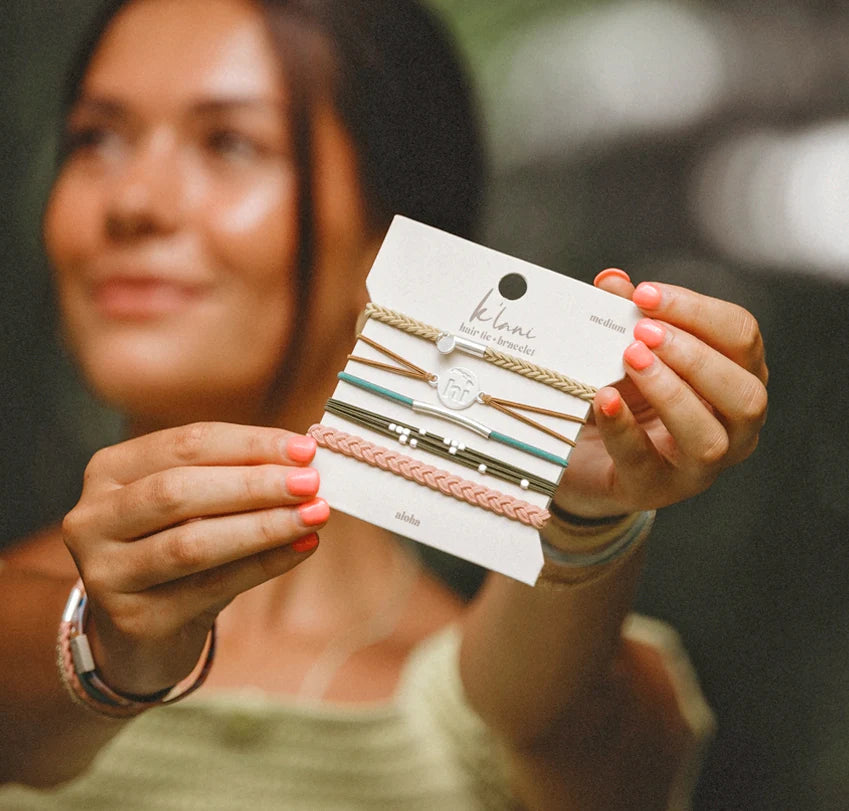 Our ALOHA set includes five bracelets that double as hair ties in vibrant tropical colors that enhance the silver Hawaiian islands charm. Wearing this bracelet stack will remind you to breathe in, breathe out and carry the spirit of Aloha.