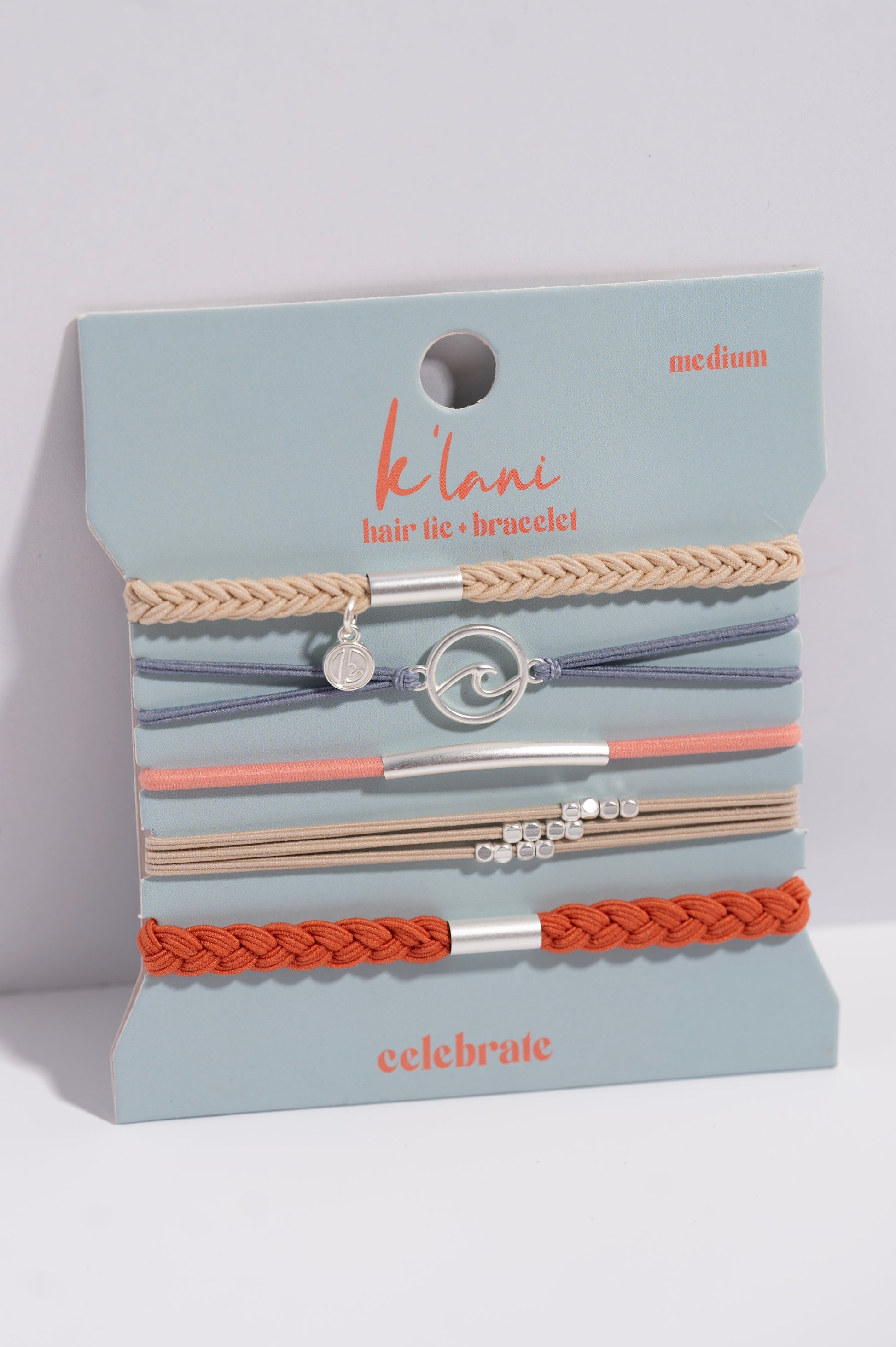 Our celebrate set includes five bracelets that double as hair ties in colors inspired by the beach - ocean blues and coral hues. The silver wave charm is the best symbol to help us celebrate our everyday swells.