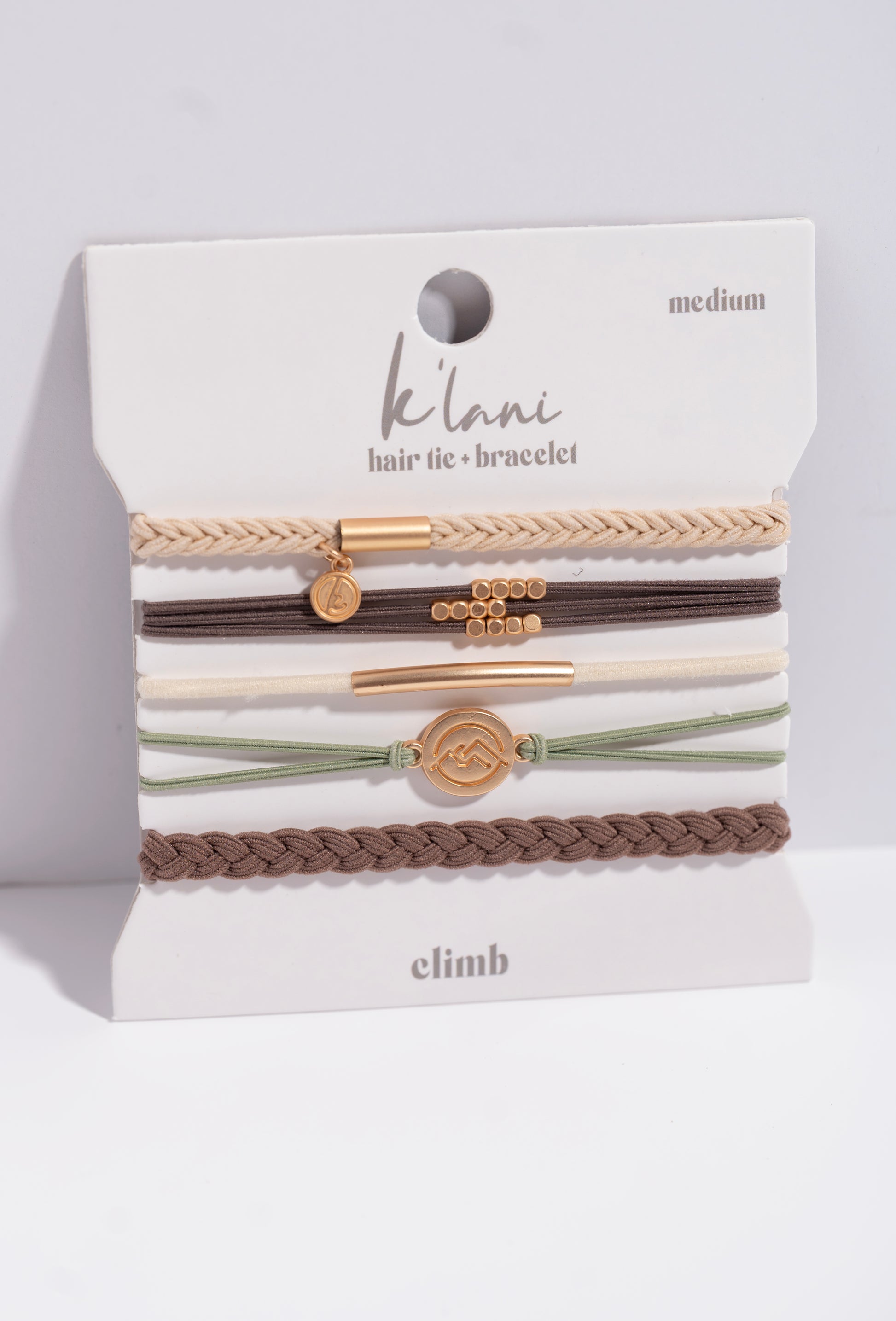Our CLIMB set includes five bracelets that double as hair ties in gorgeous warm neutrals of brown, creams, and greens. This set with mountain peaks on the gold charm will remind us that our mountain top is in reach.