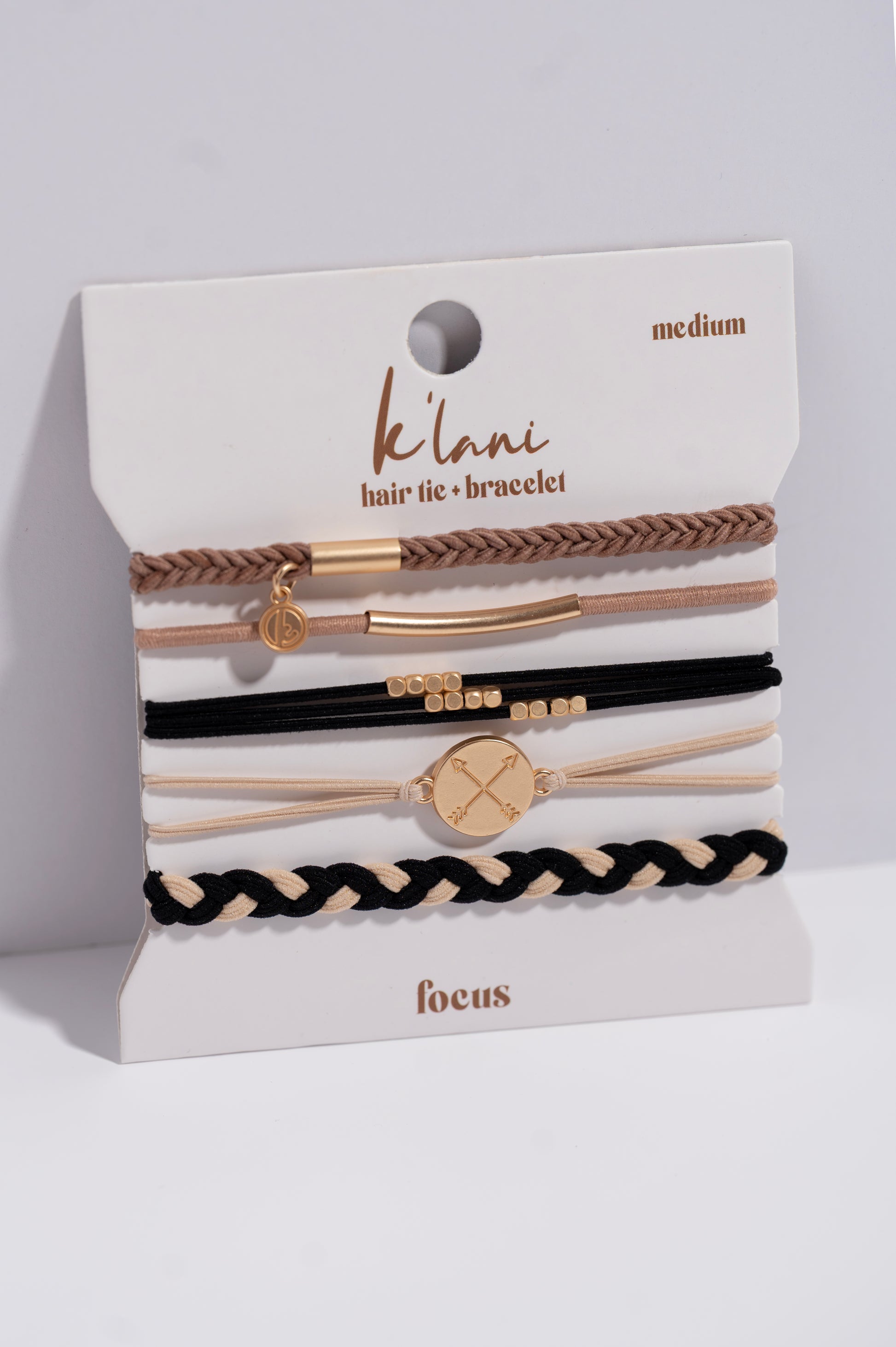 Our FOCUS set aims to please with perfectly coordinated neutrals and gold metal accents. The intersecting arrows on the round gold charm symbolize friendship, pointing in the right direction, and hitting your desired destination.