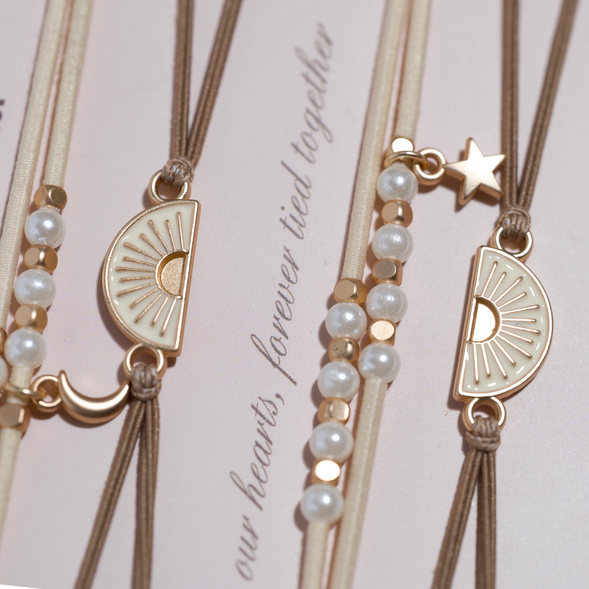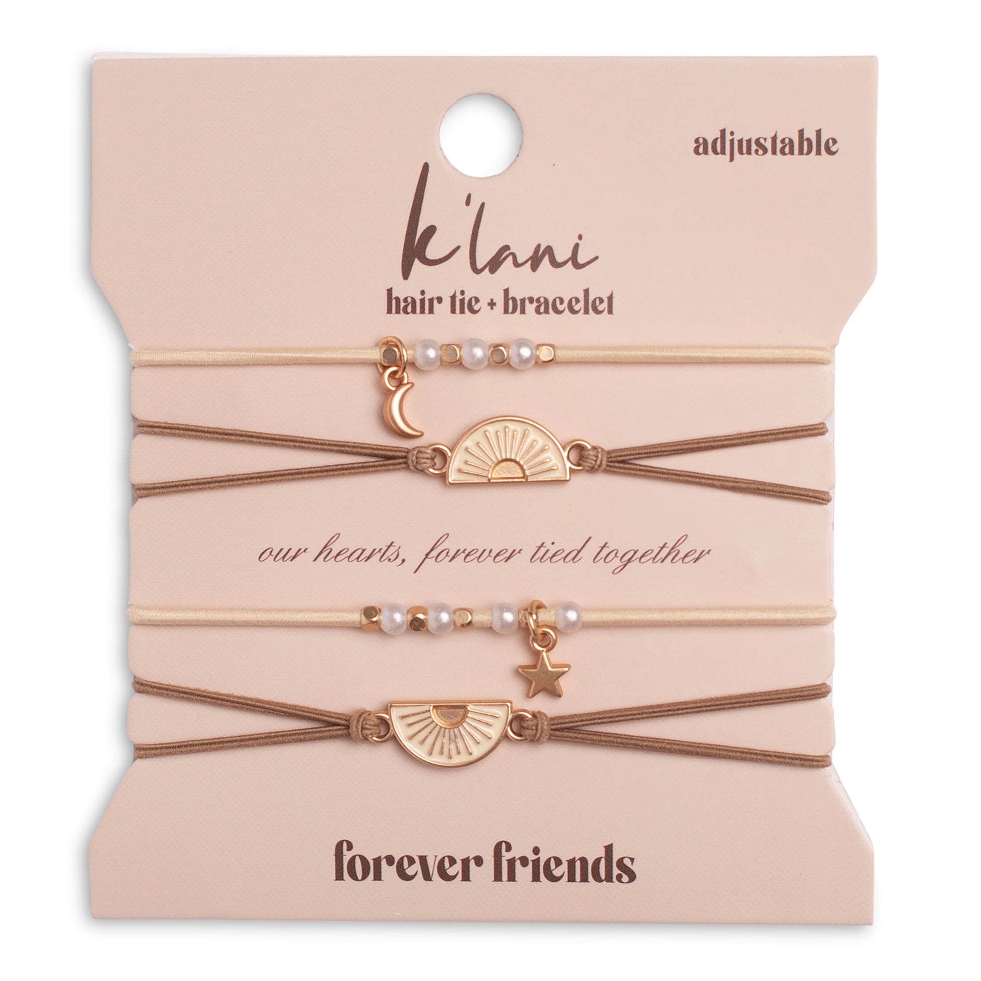 Celebrate the special connection between you and your best friend with our new Forever Friend Hair Tie Bracelet set. Each set includes four adjustable-size bracelets, with two for each friend. Featuring a half-sunrise design, these bracelets come together to form a full sunrise, with dainty star and moon charms, symbolizing the light and positivity you bring into each other's lives. Our Forever Friend Set is crafted in neutral colors to complement any style. Whether worn as a bracelet or a hair tie, these are the perfect gift to show your love to a forever friend.