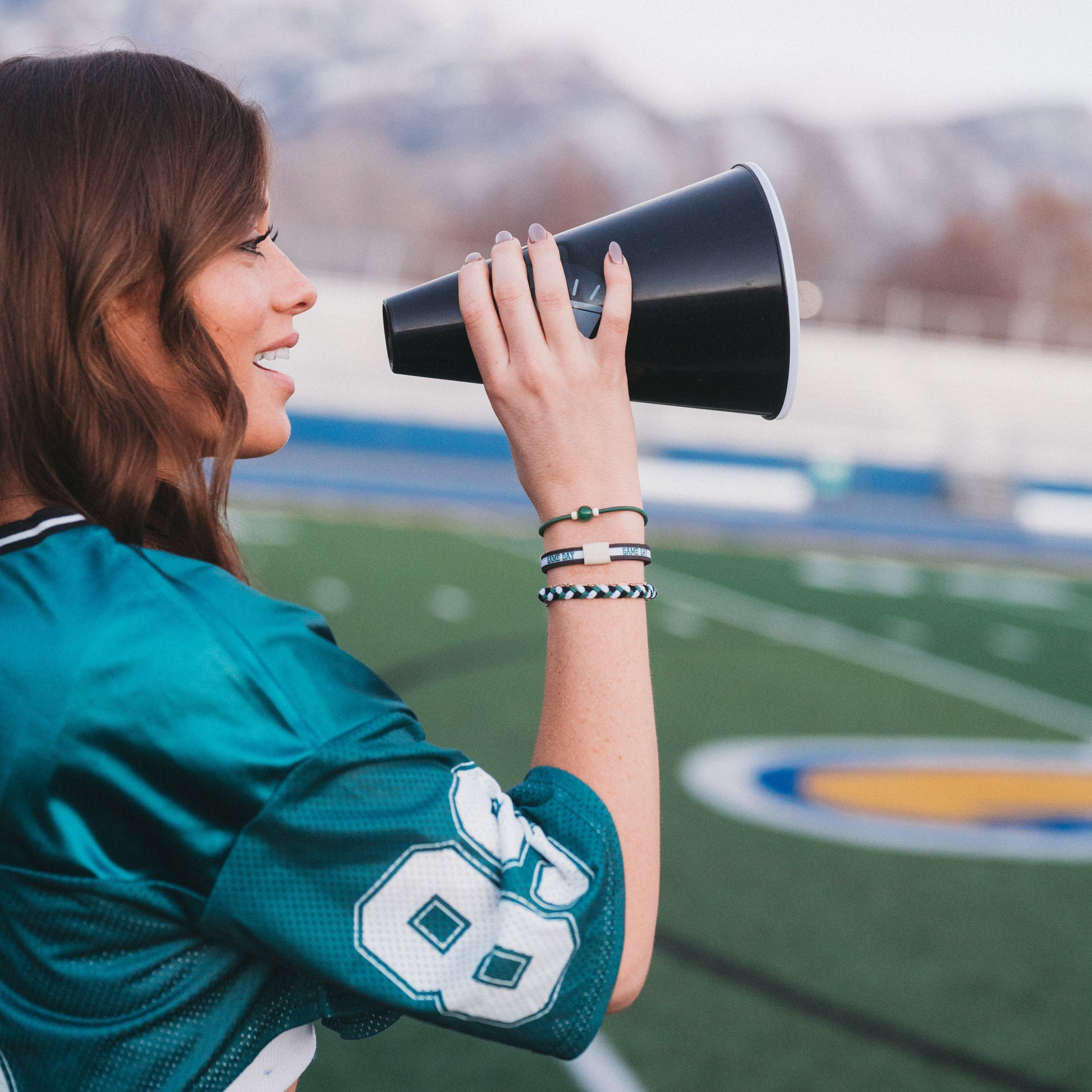 This Game Day set is made to show your school spirit with style and pride. These 5 hair tie bracelets feature bold team colors of Green and white and are perfect for cheering from the sidelines or celebrating a win. With a “Let’s Go” charm and a natural stone bead accent, this set is a fun way to support your team and wear your pride on your wrist while ready to pull your hair up when the games gets intense.