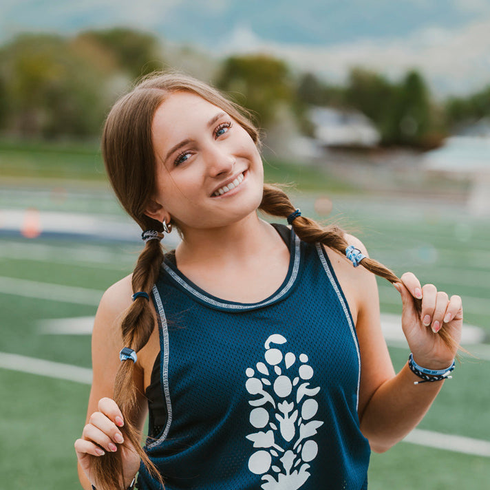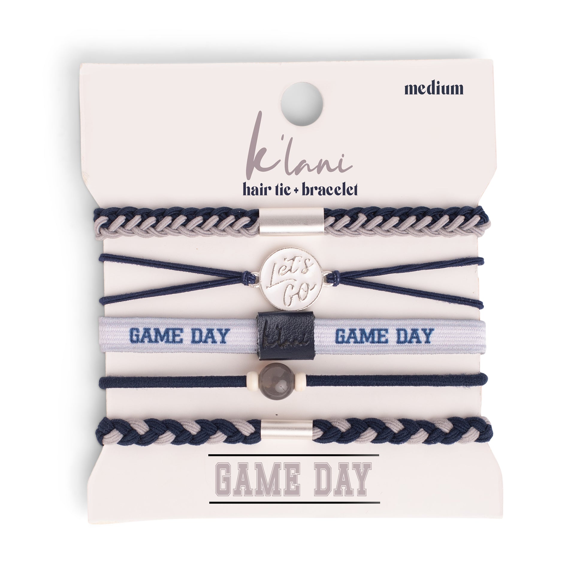 This Game Day set is made to show your school spirit with style and pride. These 5 hair tie bracelets feature bold team colors of navy and gray and are perfect for cheering from the sidelines or celebrating a win. With a “Let’s Go” charm and a natural stone bead accent, this set is a fun way to support your team and wear your pride on your wrist while ready to pull your hair up when the games gets intense.