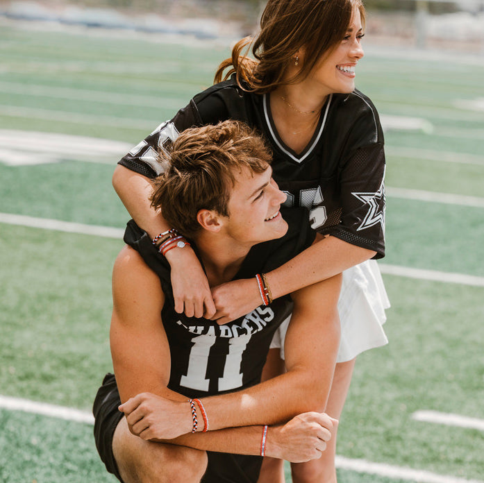 This Game Day set is made to show your school spirit with style and pride. These 5 hair tie bracelets feature bold team colors of red and white and are perfect for cheering from the sidelines or celebrating a win. With a “Let’s Go” charm and a natural stone bead accent, this set is a fun way to support your team and wear your pride on your wrist while ready to pull your hair up when the games gets intense.