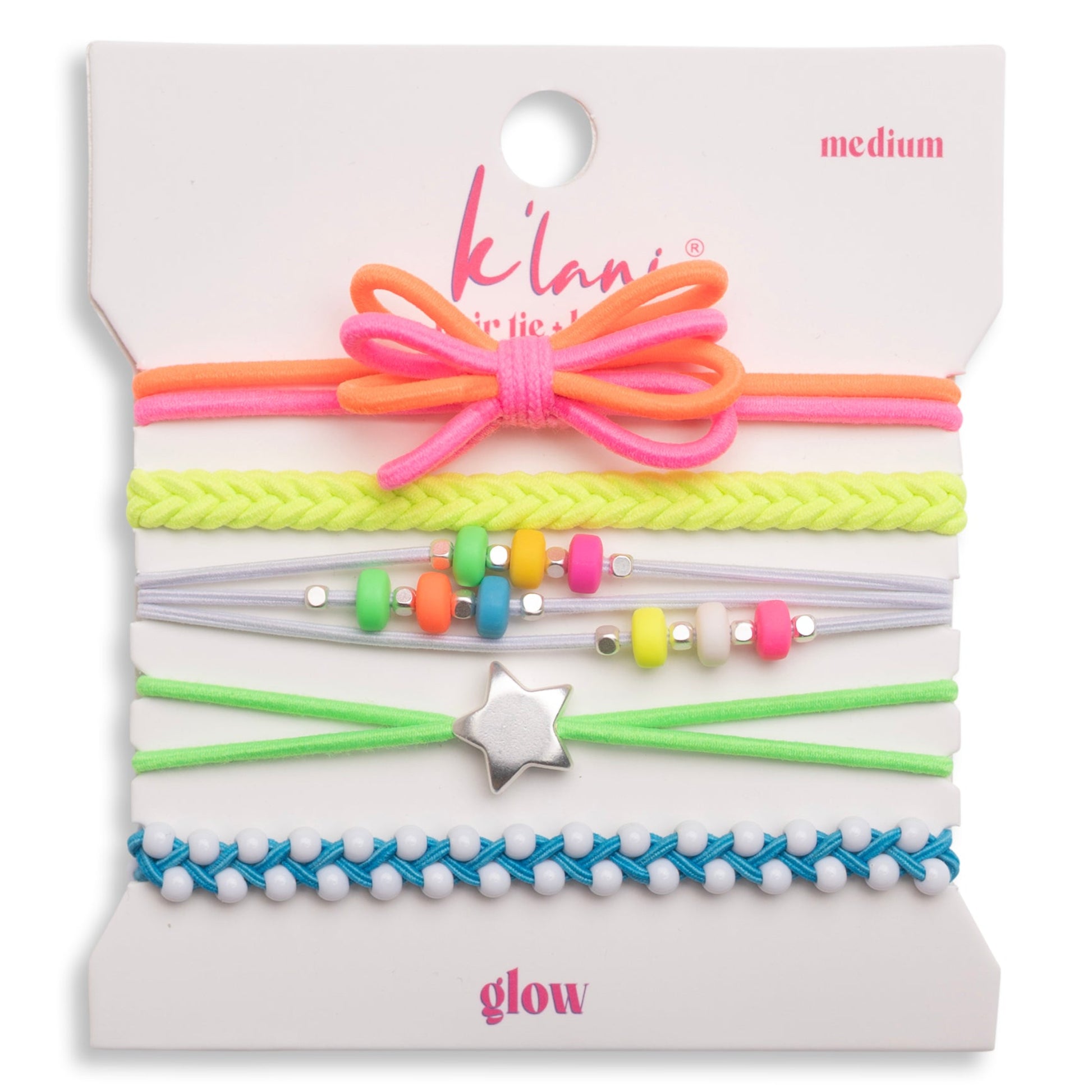 Turn up the brightness. The Glow Pack is pure 80s nostalgia—bold, playful, and impossible to miss. Inspired by neon lights, roller rinks, and carefree summer nights, this set features fluorescent brights, fun colorful beads, a statement bow, and a shining star charm that brings it all together.