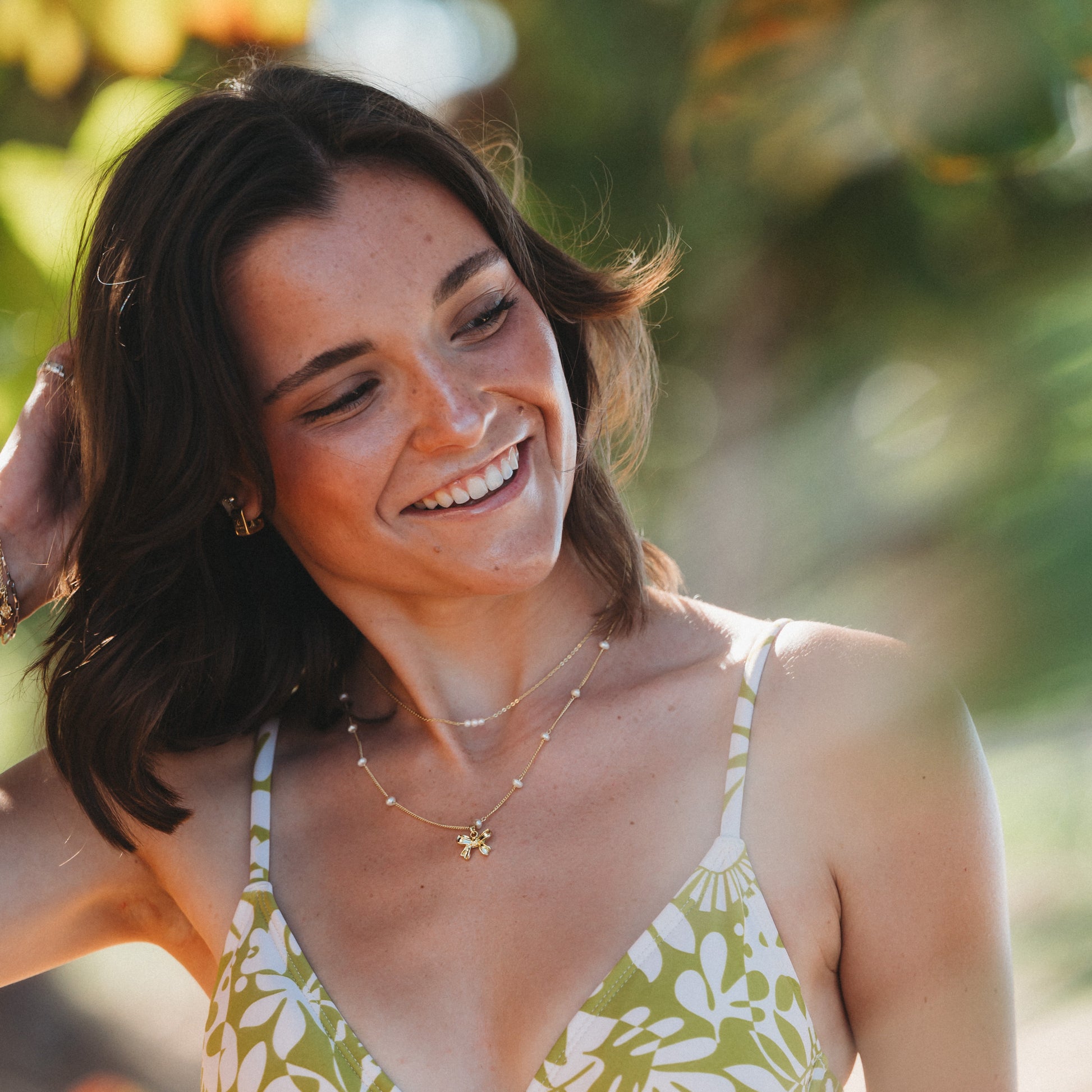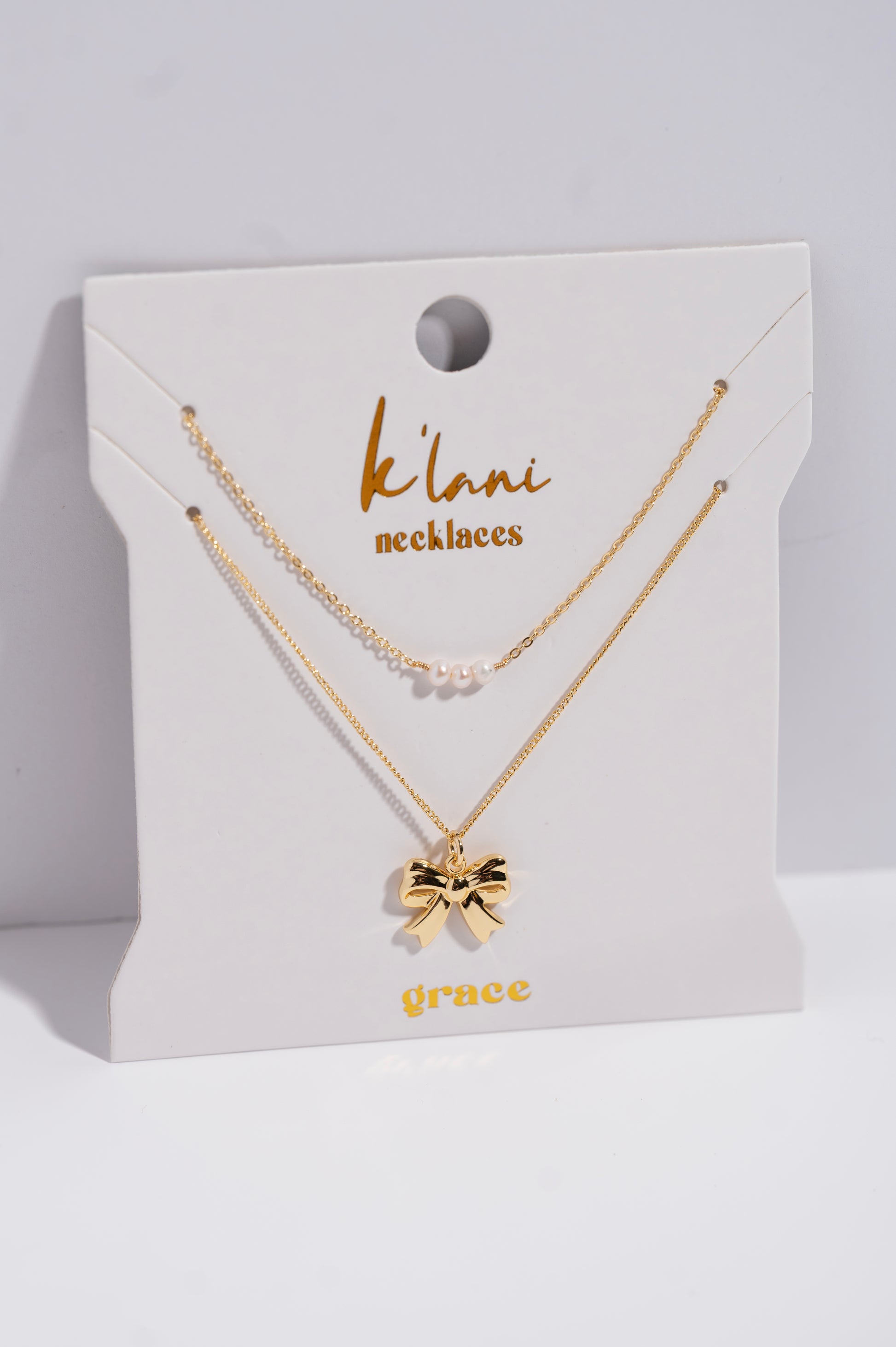 The Grace necklace set is a two-piece set that features water and sweat proof chains made from 18k gold-coated stainless steel for effortless, everyday wear. The top necklace (adjustable 14–16 inches) showcases three dainty pearls on a delicate gold chain, while the bottom necklace (adjustable 16–18 inches) features a perfectly sized, gold bow charm. Together, they’re a sweet and sophisticated reminder to move through life with grace and confidence.