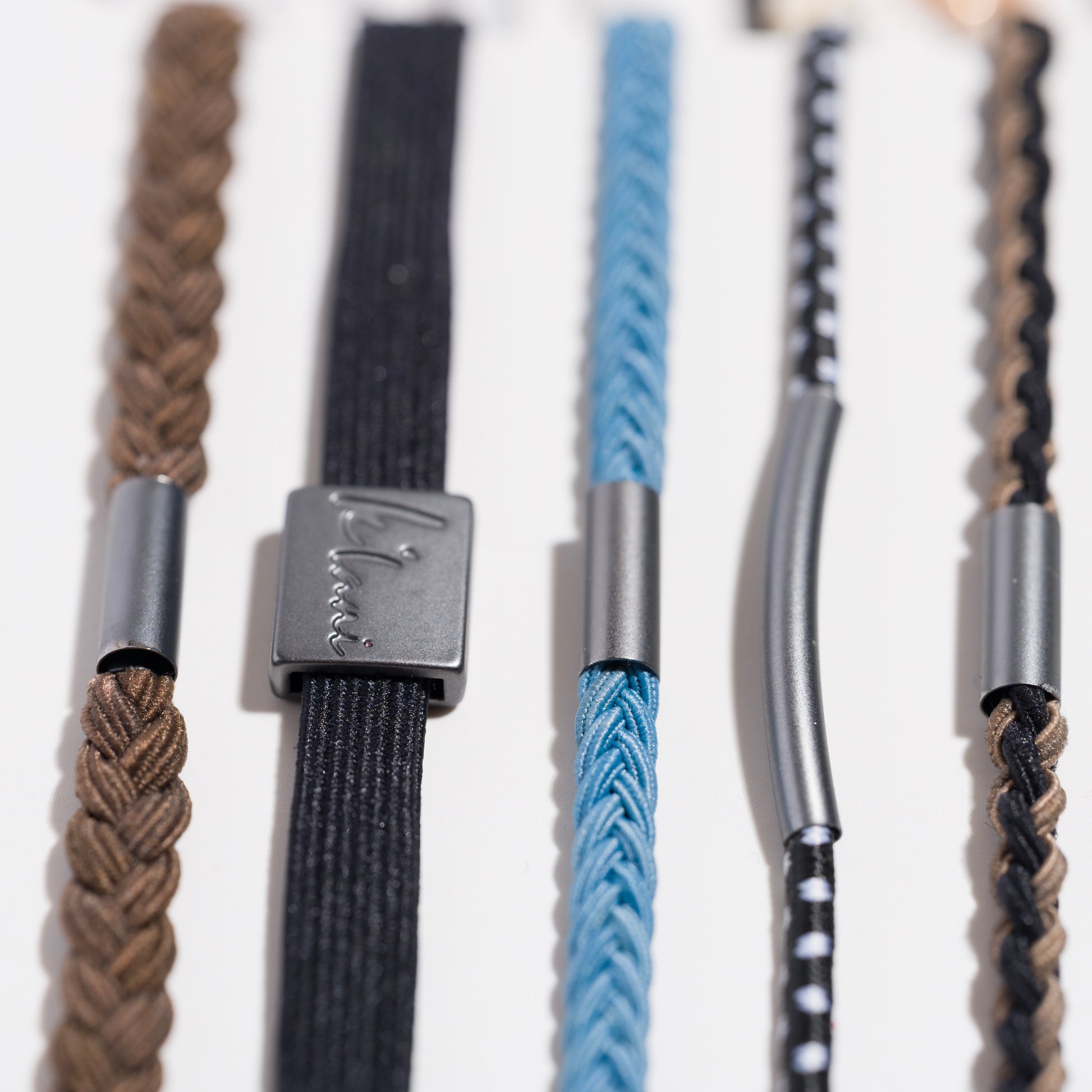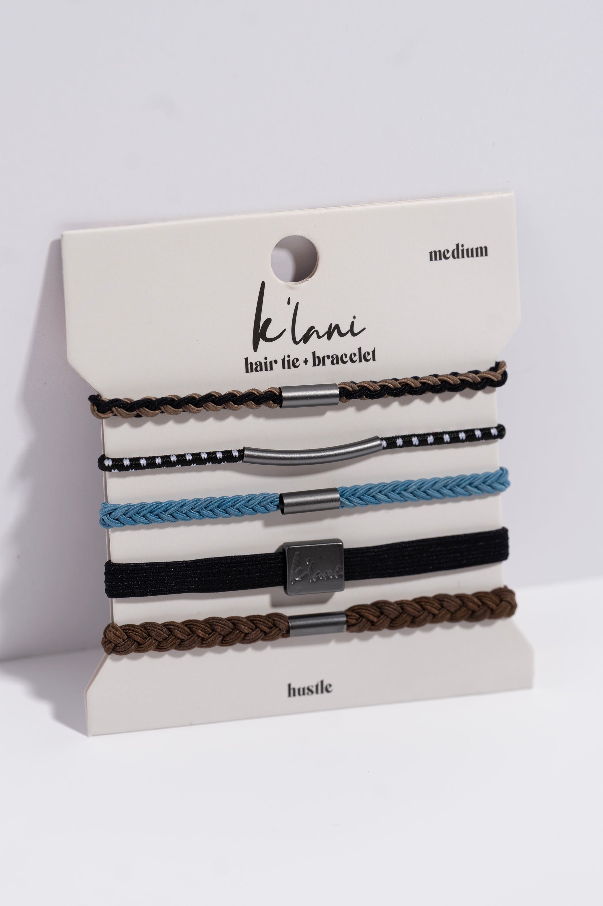 Our HUSTLE set includes five hair tie bracelets in strong colors of black, brown, and blue with matte black details. This set is perfect for guys and girls and will make all who wear it bring a little more hustle to their game.