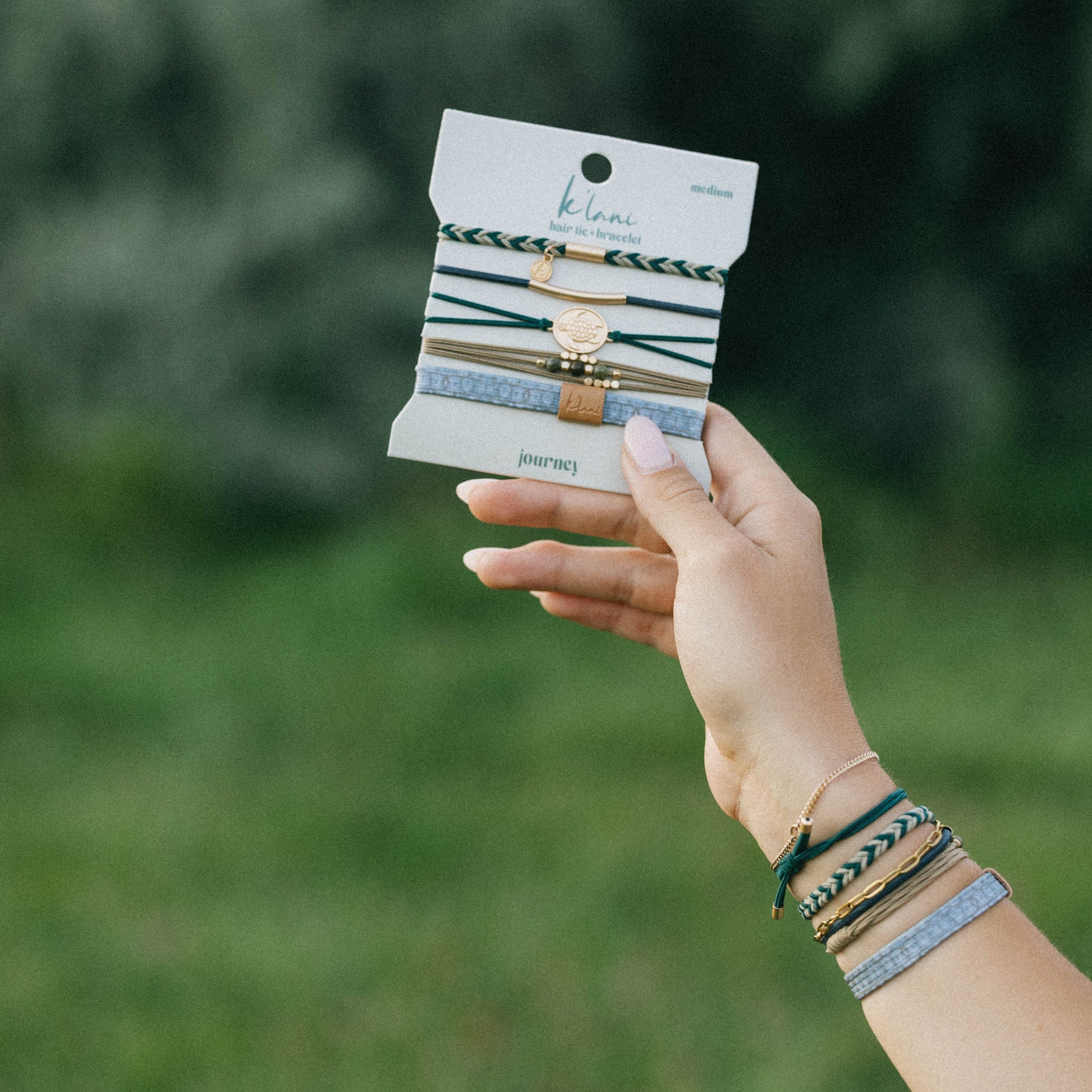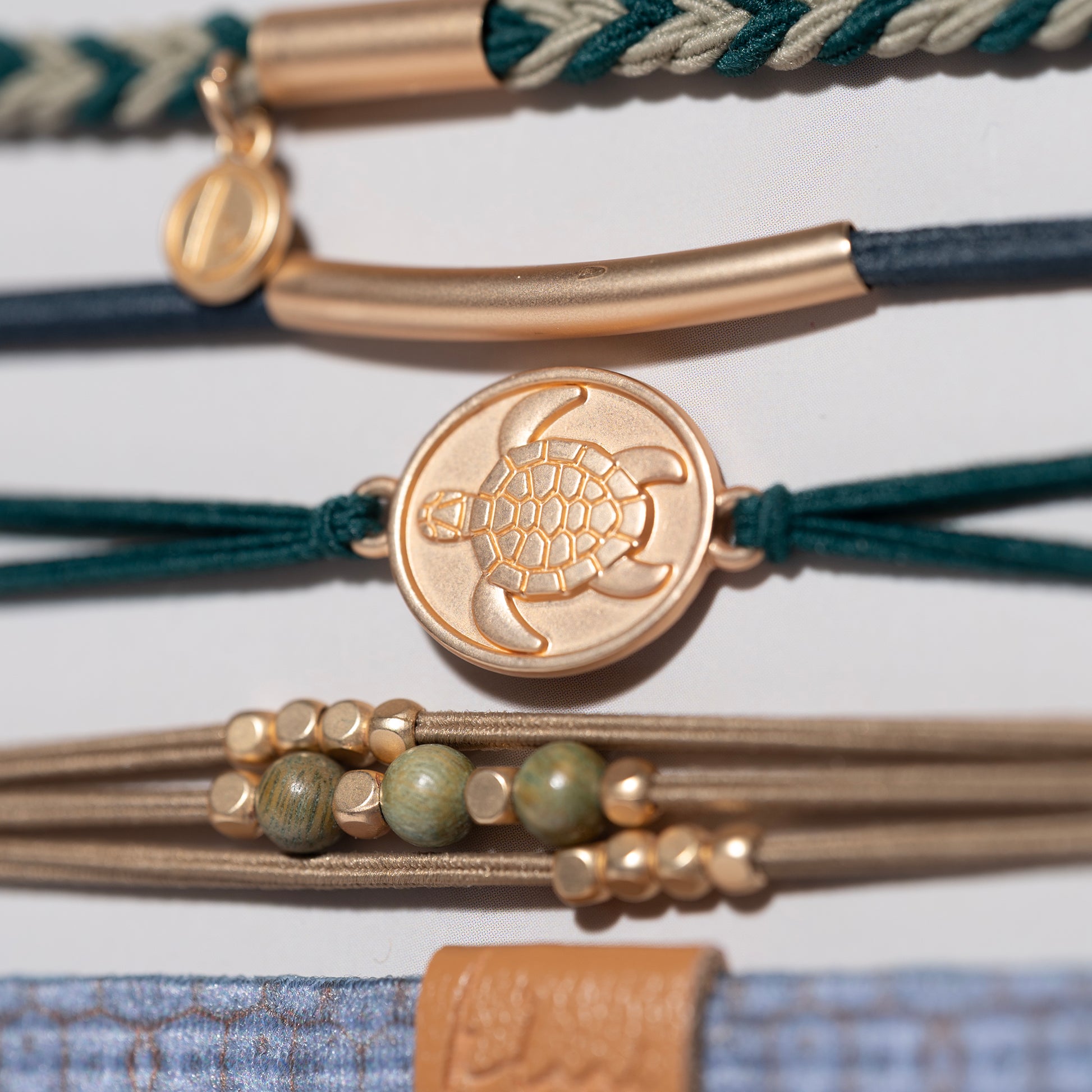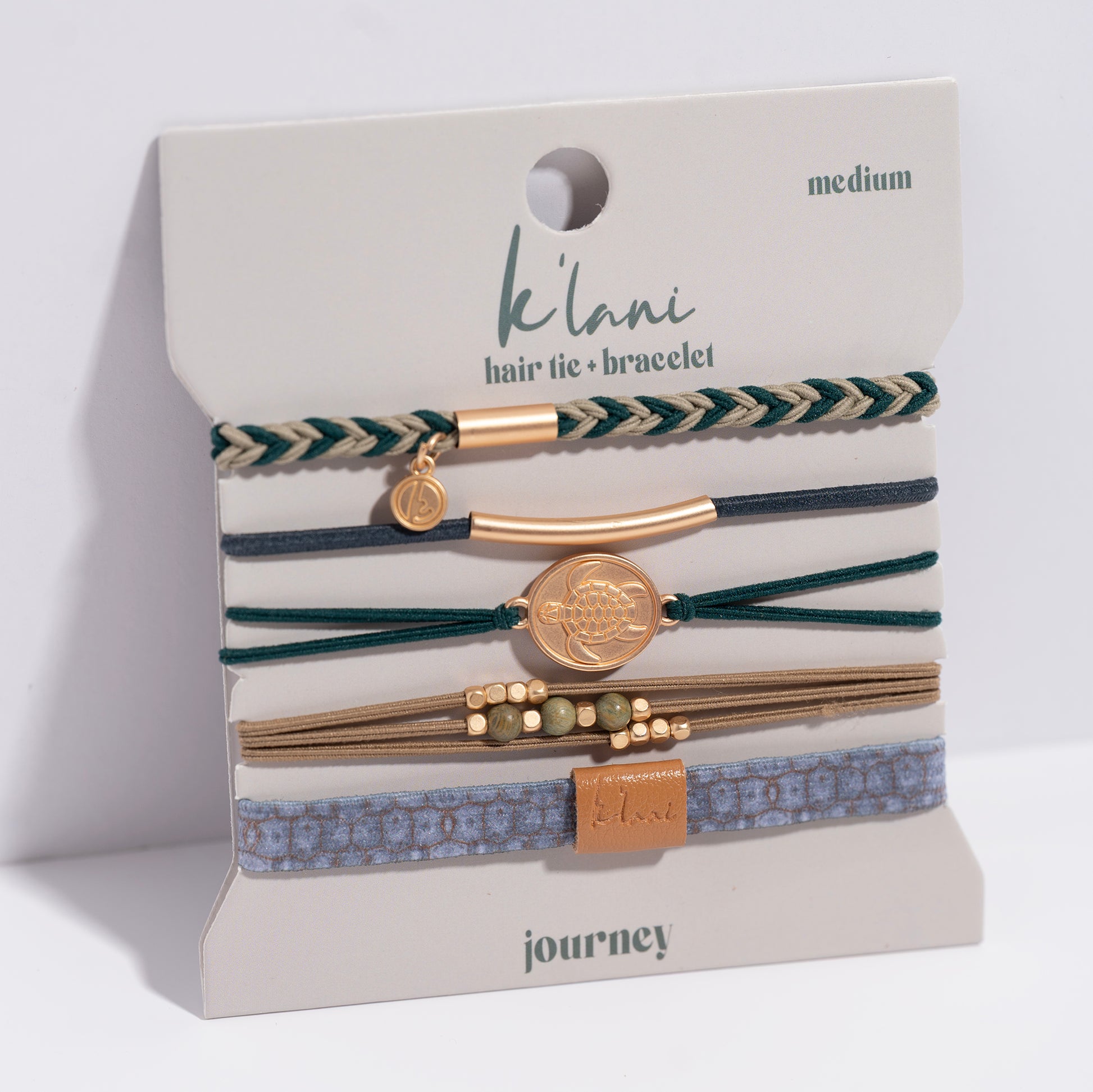 Our Journey set is inspired by steady progress, inner peace, and the beauty of the path ahead. These 5 hair tie bracelets feature calming green and neutral tones, accented with natural stone and gold beads. A gold turtle charm and a unique band with a turtle shell pattern serve as a reminder to move forward with purpose and embrace every step of your journey.
