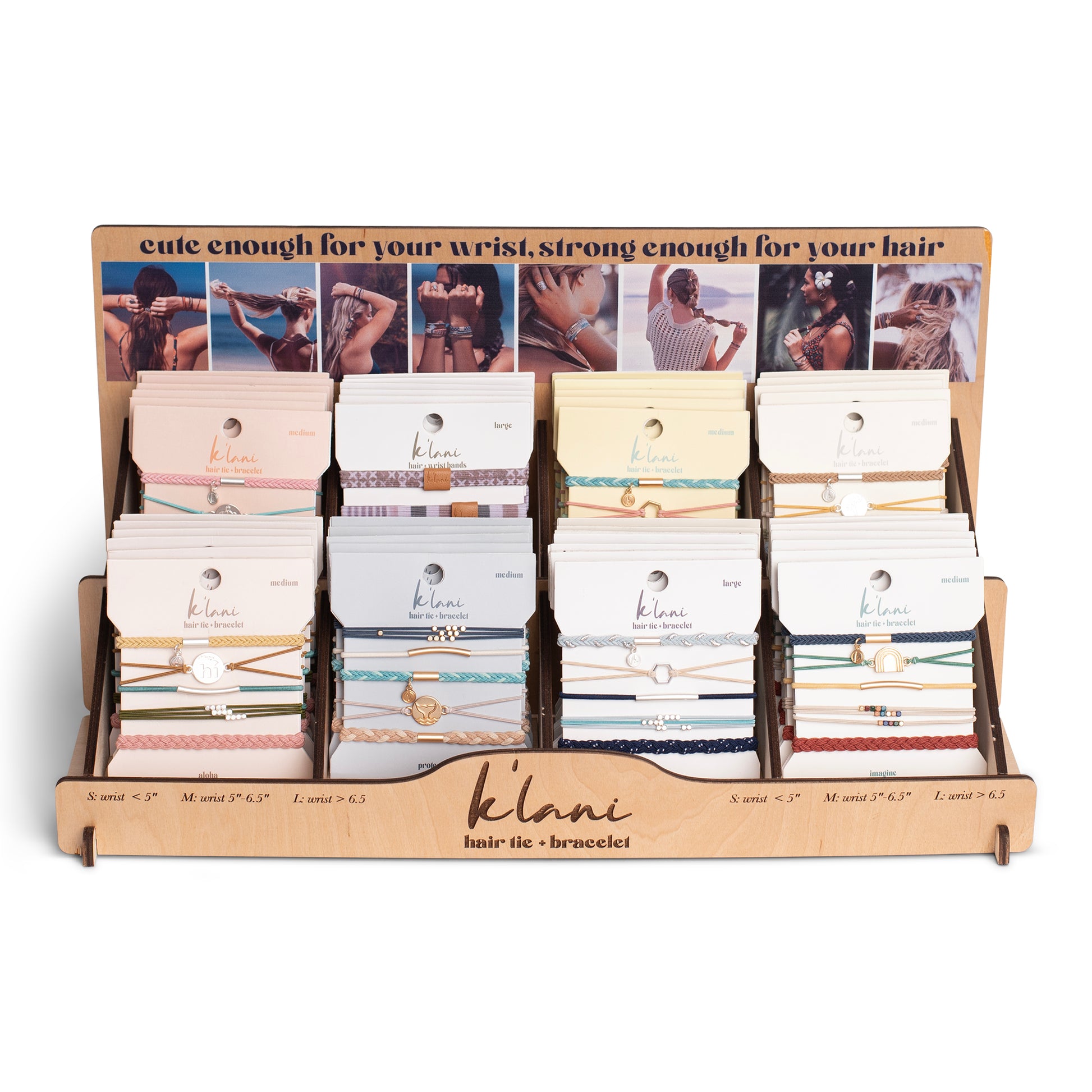 Our 2 Tier Display is 6" tall and 17" wide and 10.5" deep. It is made of wood and includes lifestyle images and the "looks like a bracelet, works like a hair tie" tagline. It comes with 8 compartments and holds up to 64 units, However it comes free to NEW customers who order at least 48 units (bracelets or necklaces). We suggest ordering an assortment of sizes in 8 styles. Size M is the best seller, Small is best for young girls and small teens, Large will be comfortable on wrists over 7".