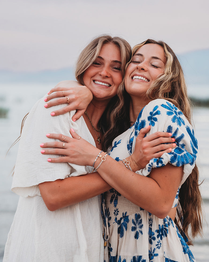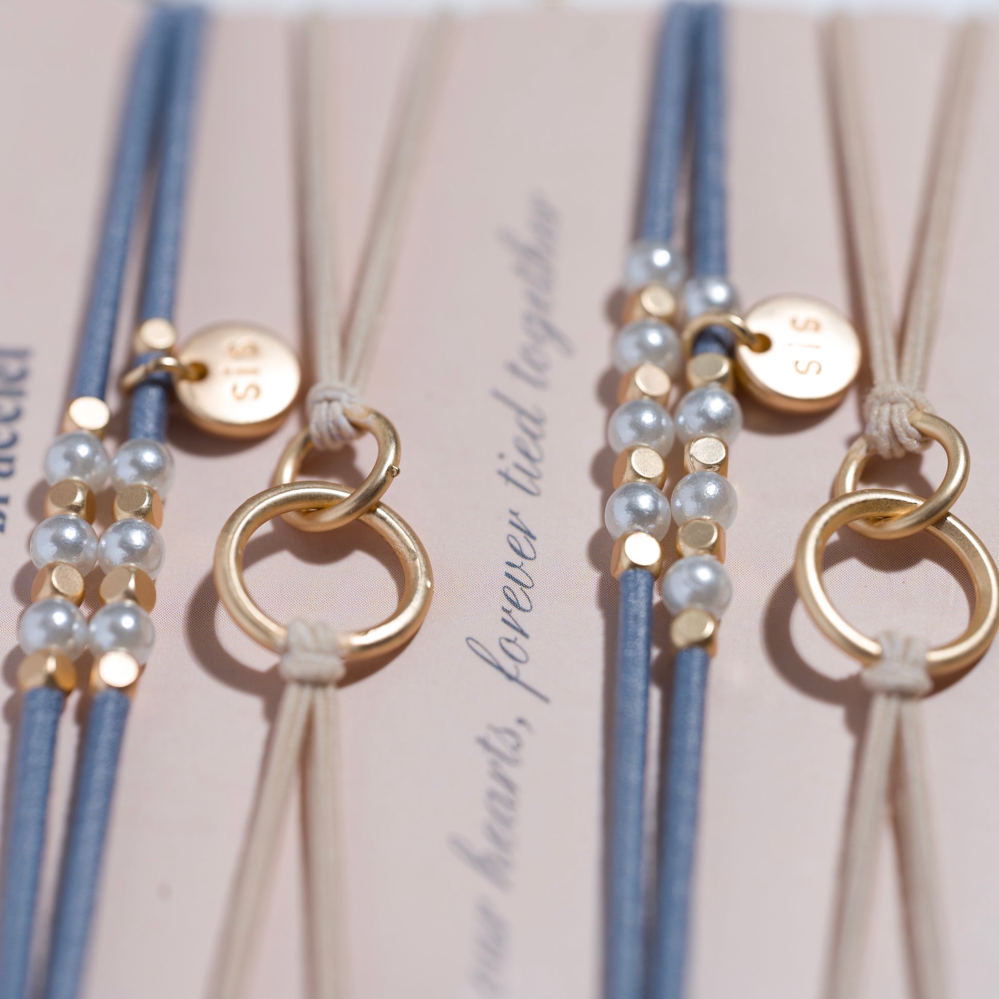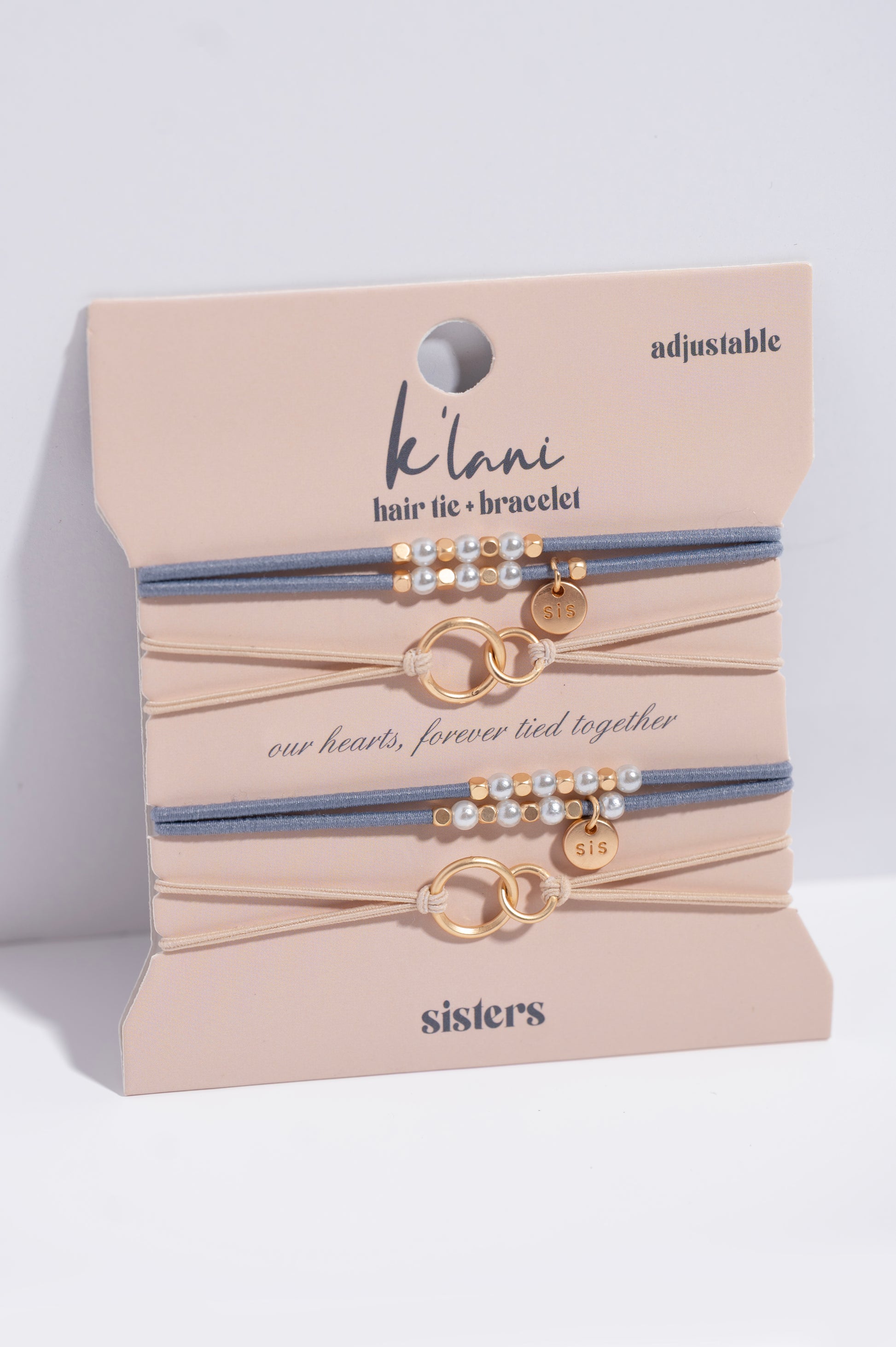 Introducing our new Sisters shareable hair tie & bracelet set. These are designed to celebrate the special connection between sisters! This beautiful set features dainty gold medal charms engraved with "Sis," along with delicate pearls, neutral colors, gold beads and interconnecting circles symbolizing the timeless bond you share. Whether worn as a hair tie or a bracelet, these accessories are fully adjustable to fit all sisters of every size and age. This darling set, perfect for gifting and sharing with your sister, this set lets you carry a little piece of your love with you every day.
