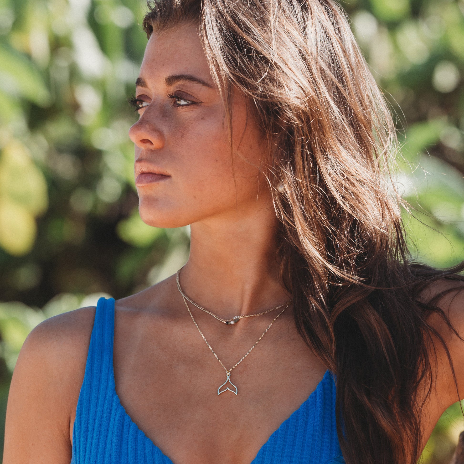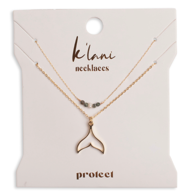 The Protect Necklace set is waterproof and non-fading made from 18K Gold plated stainless steel. The first necklace is beautifully crafted and adjustable from 16"-18". This is a gorgeous matte gold color and the perfect sized whale tale hanging from the sturdy chain. The second necklace features 3 dainty natural stones on an adjustable 14"-16" chain layering perfectly above the whale tale. This set coordinates with our Protect hair tie bracelets.