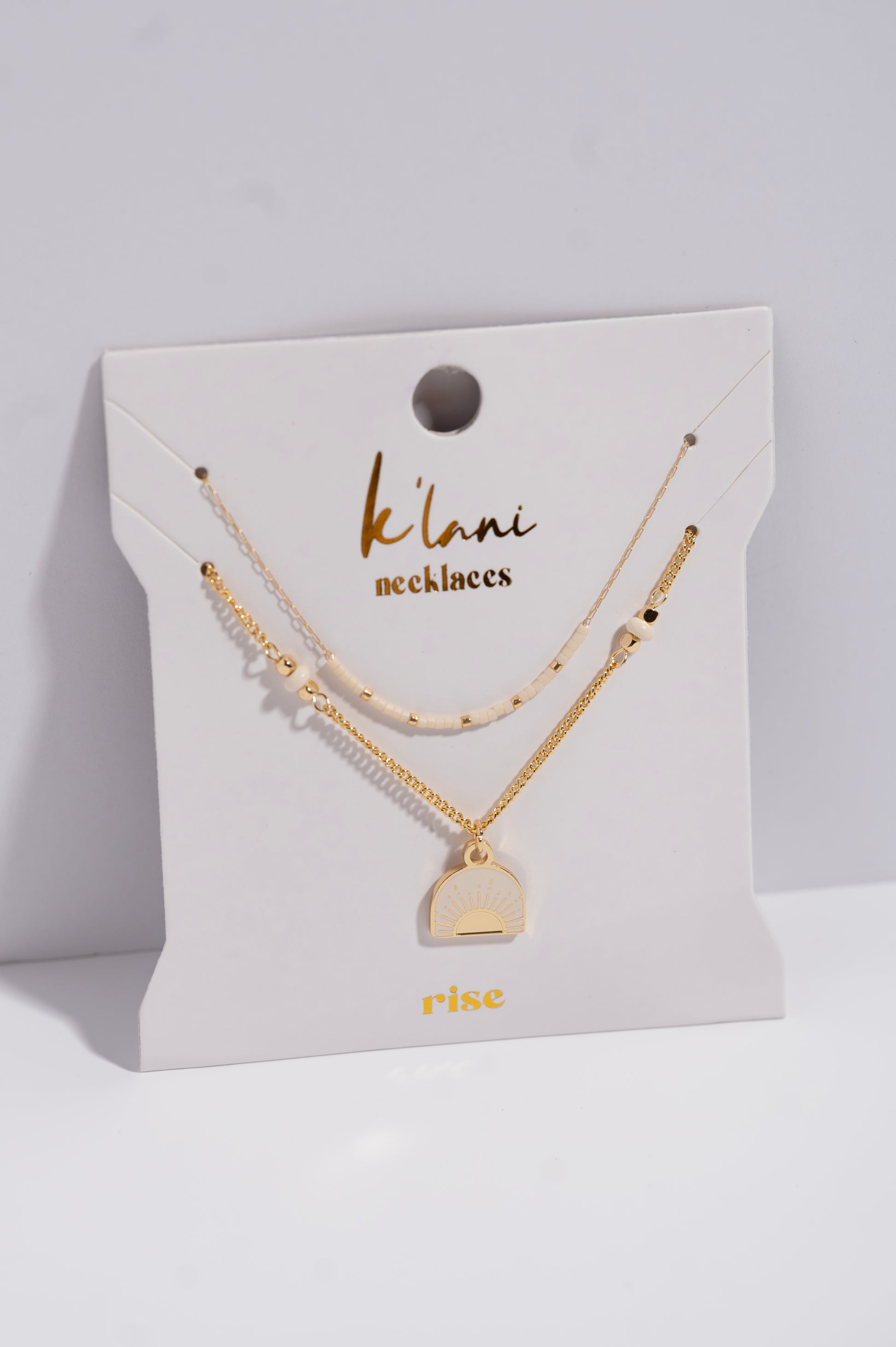 The Rise Necklace set is waterproof and non-fading made from 18K Gold plated stainless steel. The first necklace is beautifully crafted and adjustable from 16"-18". This is a gorgeous gold a with a gold and cream sunrise hanging from the sturdy chain infused with cream natural stone beads. The second necklace features a delicate row of cream natural stone beads on an adjustable 14"-16" chain layering perfectly above the sunrise. This set coordinates with our Rise hair tie bracelets.