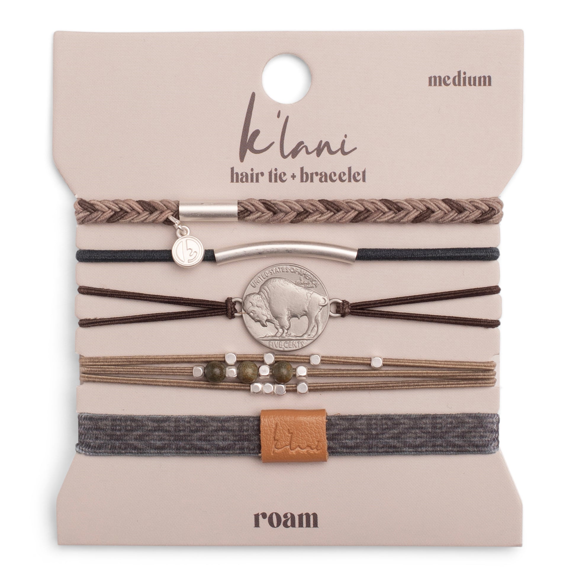 Our Roam set captures the spirit of adventure and the grounding beauty of the earth. These 5 hair tie bracelets feature bold neutral tones in navy, gray, and tan, complemented by antique buffalo, nickel, and earth-colored stone beads. This set is a reminder to explore freely, stay grounded, and embrace the journey wherever you roam.