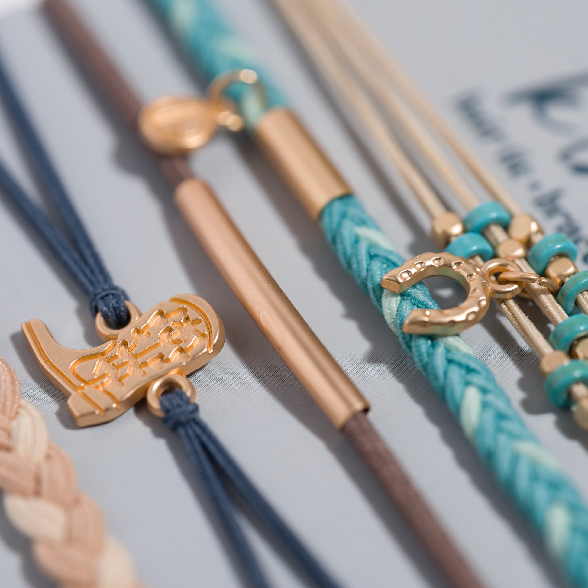 STRIDE Our Stride set includes five bracelets that double as hair ties in the cutest coastal cowgirl colors of blue, brown, cream and teal. This set features dainty boot and horseshoe gold charms that will remind you to lengthen your stride and cowgirl up.
