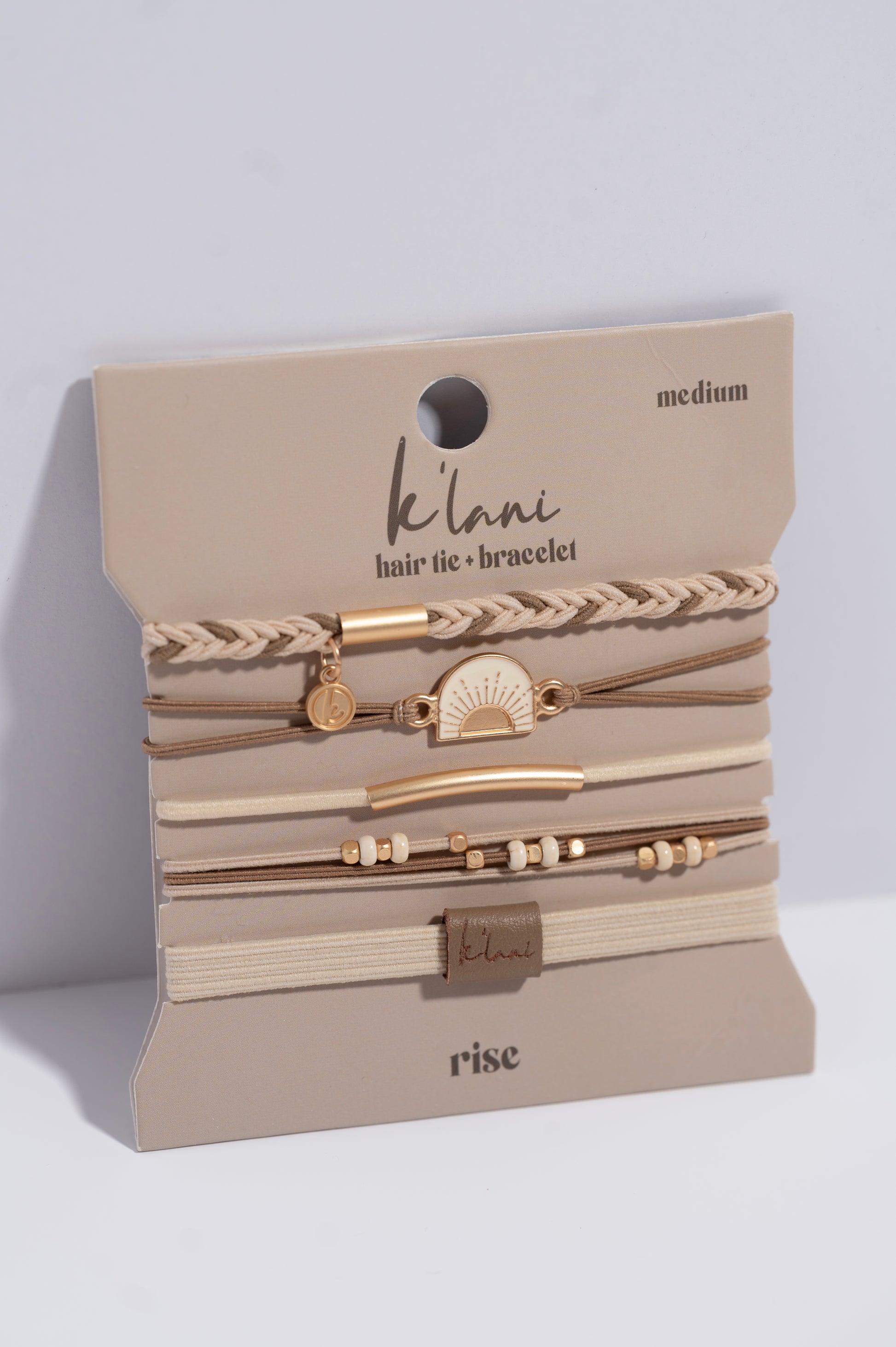 Rise Our Rise set includes five bracelets that double as hair ties in warm neutrals and gold and cream accents that will go with any outfit. The sunrise charm reminds us to rise up and shine every moment.